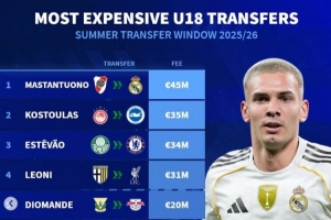 体育资讯9月5日讯 《转会市场》统计了今夏的U18球员最贵转会费榜单,皇马4500万签下马斯坦托诺居首。
